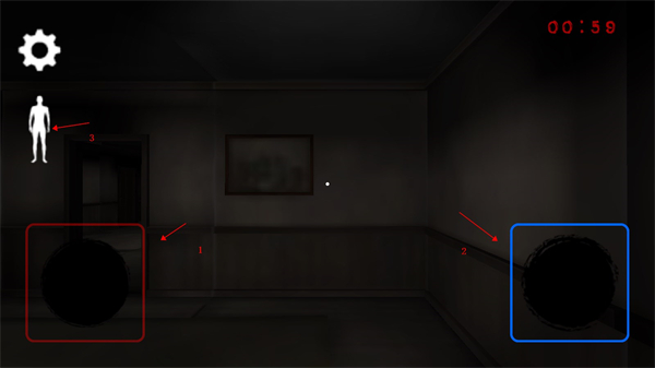 4、在下图中,按钮1用于控制人物行动,按钮2负责控制人物视角方向,按钮3可实现人物蹲下或站起的操作。玩家通过操控人物成功逃离房间,即可达成通关条件。