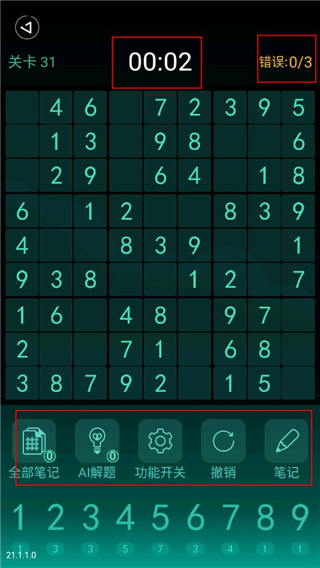 3、进入游戏后,玩家拥有三次机会,并且存在时间限制。此时,我们能够借助下方的笔记、AI解题、功能开关、撤销以及笔记等功能选项,来更顺利地通关。
