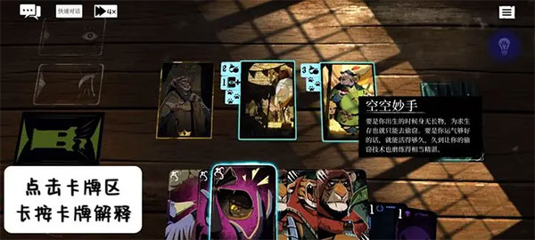 先来说说游戏里冒险者们最常接触的场地界面。画面底部从左至右依次是角色的技能卡、位于中间的角色状态卡以及右侧的资源卡。画面正中央会生成3到6张场景卡,玩家能够借助手中的技能卡与资源卡和场景卡进行互动,从而实现各式各样的效果。长按场景卡,手上可与之交互的卡牌会高亮显示;反之,长按卡牌,能与之交互的场景卡会高亮,并提示交互效果。