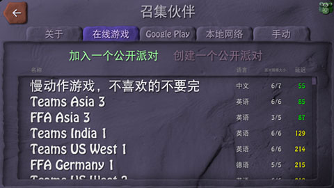 进入游戏后,会出现一个“召集玩家”的选项,点击进入该选项。接着,选择“在线游戏”,这时就能看到许多房间。需要留意的是,建议优先选择语言为中文的房间,因为这类房间延迟相对较低,每个房间后面都显示了ping值,大家注意查看。要是想和伙伴一起开黑,那就选择创建一个公开派对,等伙伴进来即可。