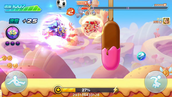 3、进入到游戏之后,有两个按键,分别是滑铲和跳跃的按键,他们都是都是用来躲避游戏中的障碍和拾取金币使用,我们需要尽量跑的更远,获得更高的分数;