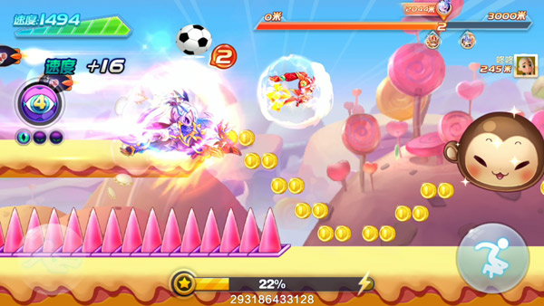 5、开局点出超级完美后,要是碰到开局减速云,有两种选择。其一,先不飞,等过了减速云再飞;其二,直接通过3跳到达减速云上方,利用卡滑翔放技能的方式滑过减速云。这里建议选择先不飞。对于暗黑大圣的技能,其操作方式为:发动技能后不要立刻松手,而是持续按着,待进入超级冲刺后马上松开,这样做可以节约能量,因为每按1次技能就会扣除能量,所以不能立马松手,要是气力槽没吃满,很容易就浪费技能了。
