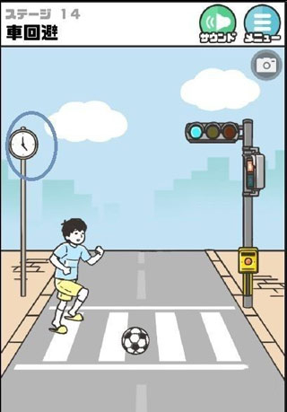 第十四关,等小明走到马路中间,点一下左边杆子上的时钟使用时间暂停,真的是时间暂停,在点一下右边红绿灯杆下面的黄色的开关,等红灯了在点时钟就过关了!!