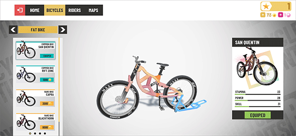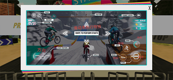在游戏里,你还能用金币购买各类不同的自行车。每一款自行车,都能为你带来独一无二的驾驶感受与速度体验。至于金币的获取途径,一是在比赛赛道上收集,二是通过表演特技来赚取,而且特技难度越高,得到的金币也就越多。