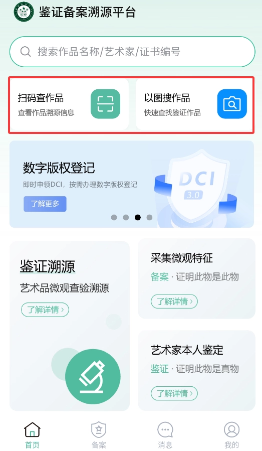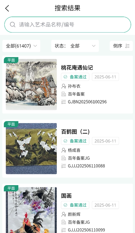 2、通过搜索栏输入作品名称、艺术家或证书编号,可快速查询备案数据库。