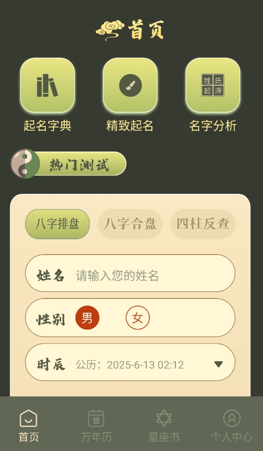 1. 打开应用,进入首页后,点击“八字排盘”功能选项,接着输入出生时间等相关信息,系统便会自动生成详尽的命理分析报告。