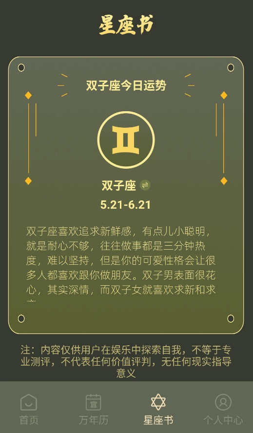 4、星座深度解析:结合西方星座与东方命理,提供每日运势、性格分析等全方位星座解读。