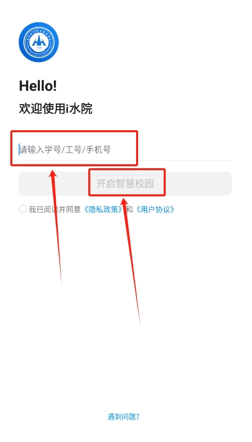 2、 进入软件界面,在指定位置输入自己的学号或者手机号,填完后点击 “开启智慧校园”,进行登录操作 。