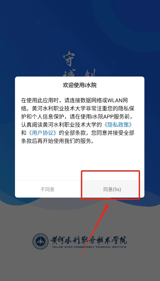 1. 完成i水院的安装后,打开该软件,首先呈现在眼前的是软件协议页面,毫不犹豫地点击 “同意” 。