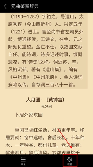 1、点击屏幕中间区域,会弹出上下菜单栏,点击右下方“设置”按钮进入亮度/字体/背景色调节面板: