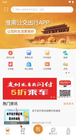 淮南行,作为一个全面的公交出行服务平台,能让市民便捷地查看周边公交站点,知悉站点详尽信息,实时把控公交车辆的运行状况,提前知晓车辆抵达指定站点的时间,进而合理规划个人出行时间。当市民要前往不同目的地时,淮南行可为用户给出最优换乘方案,助力用户迅速找到最适配的公交线路组合,保障出行更为高效。为契合不同市民的个性化出行需求,淮南行还推出定制公交服务,市民能够依据自身出行需求,定制专属公交路线,享受更为私密的出行服务。有需求的用户,欢迎在本站使用!
