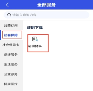 2.选择“社会保障”,下滑找到“证明”模块,点击“证明材料”。