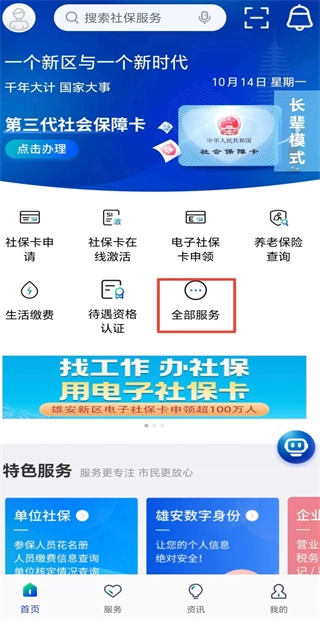 1.打开雄安智慧社保,在菜单栏中,点击“全部服务”。