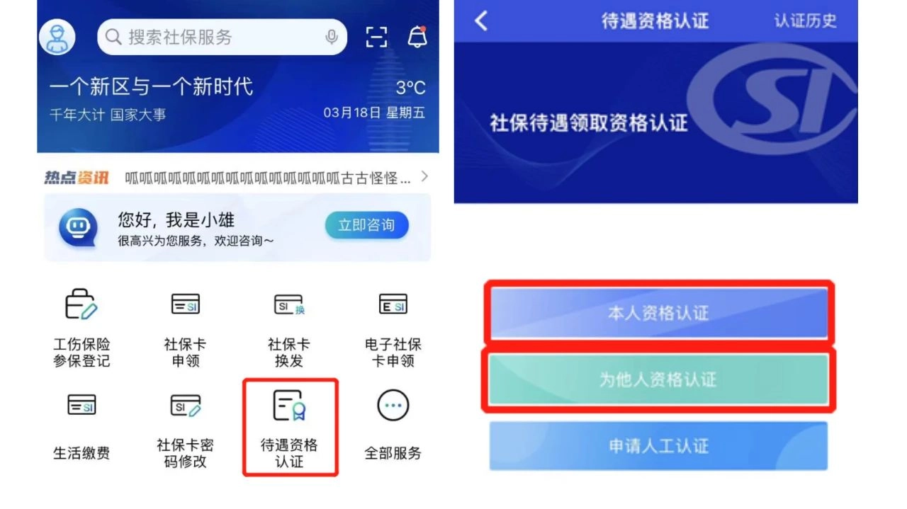 第二步:点击首页“待遇资格认证”。选择“本人资格认证”或“为他人资格认证”。