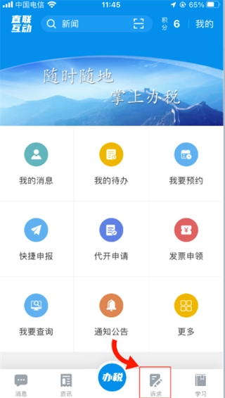 1. 用户需先在应用的登录页面完成自然人办税注册以及实名认证操作,随后进入应用界面,点击底部导航栏中的【诉求】。