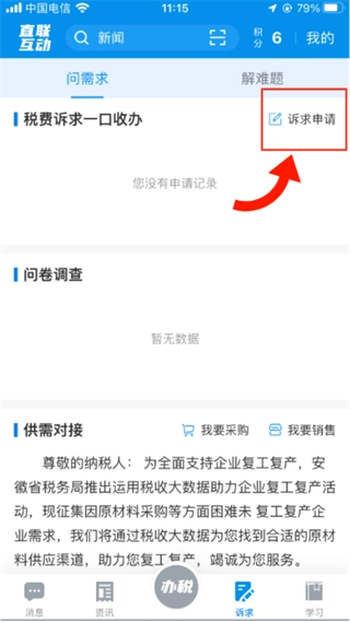 2、接着进入诉求页面中点击【诉求申请】