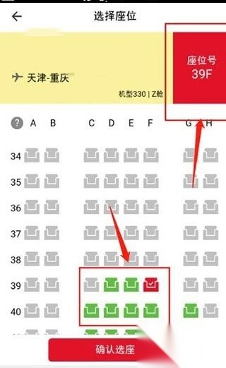 5、之后的页面就是选择座位的列表了,我们选择我们自己想要乘坐的位置,然后我们选择点击“确认选座”的图标。