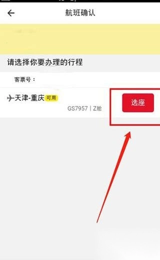 4、然后接下来的页面我们就可以看到需要值机的航班的信息了,我们选择点击确认信息无误后,然后我们选择点击“选座”的选项。