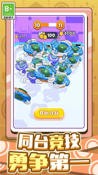 1、游戏采用合成进化机制,只需把两个相同的陀螺合成就能升级,解锁更多形态;