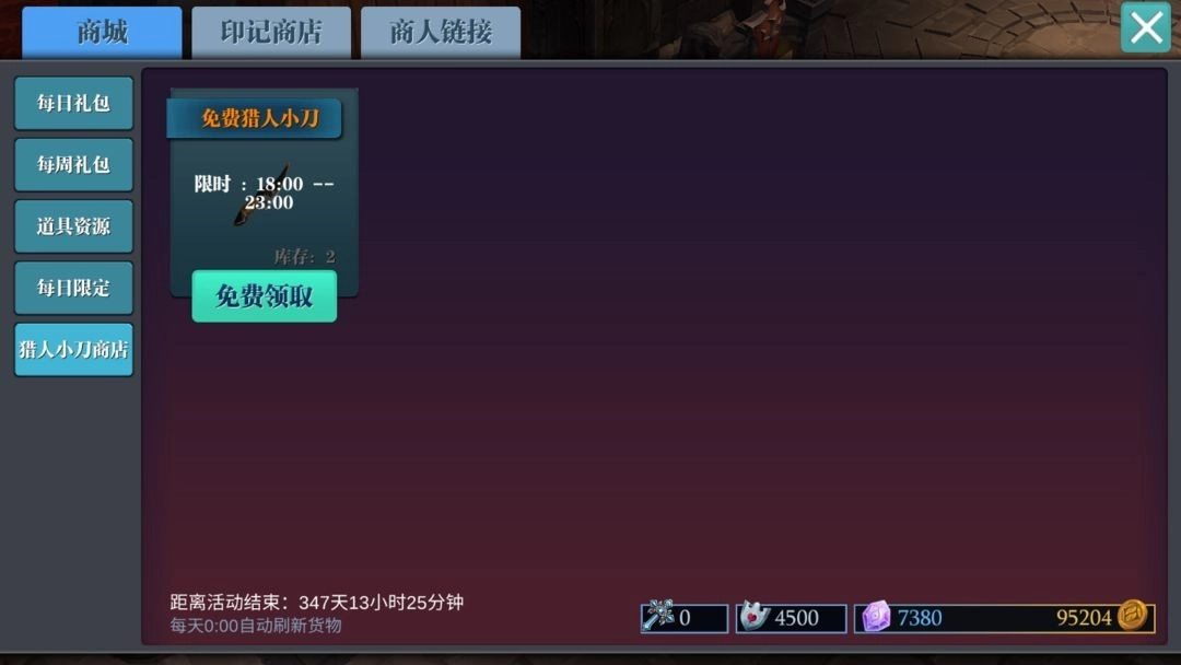 同时商店里还有各种免费礼包等你领取,点开商店就可以看到免费每日礼包和每周礼包。每天18:00-23:00可以免费领取免费猎人小刀,过时不候,不要忘记哦!
