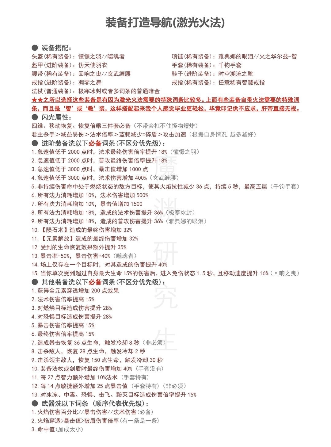 装备是重中之重,洗好完美的装备词条,能让你的伤害提升十几倍,一点不夸张。所以我也是历经九九八十一天时间做了下面这一个激光火法的装备打造导航供大家参考参考: