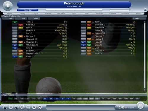 几个重要的选项:(1)squad是球队配置设定,通过这个选项进入球员23人大名单选择,了解球员状态、情绪、能力,同时含有的选项,也就是会晤,可以调节球员的一些相关内容.Tactics选项,可以设置球队阵容及球风,这三个选项是游戏最重要的元素.