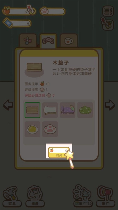建议玩家在前期优先解锁菜单和按摩垫,将按摩垫和菜单解锁到一定阶段,拥有了一定资金后再考虑购置家具,锦上添花。