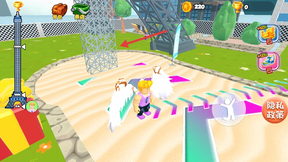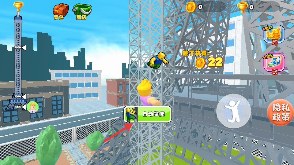 3、点击【自动攀爬】,角色沿铁塔上升,途中可获取金币。