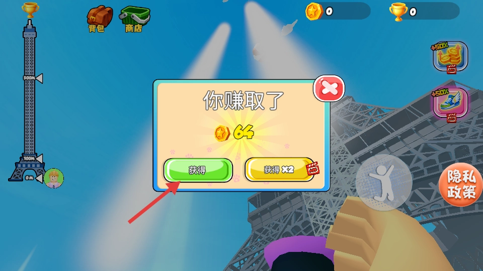 4、攀爬结束,点击【获得】领金币,或看广告翻倍奖励。