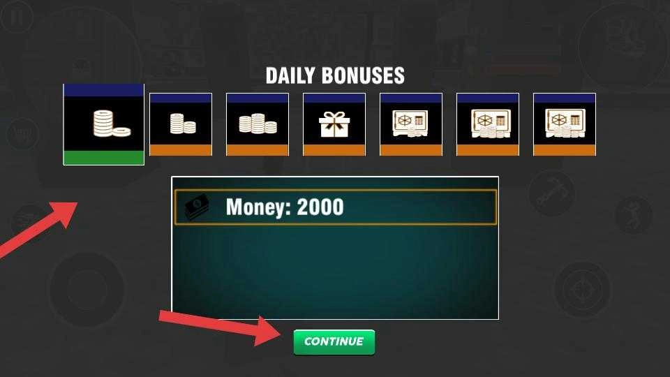 2、首次进入会弹出DAILY BONUSES界面,可领取2000Money,之后点击CONTINUE,正式进入游戏场景。