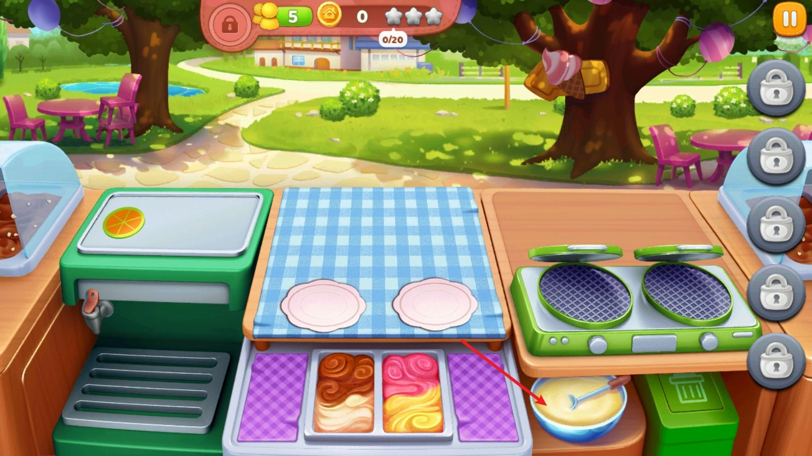 2、接着让我们看看如何进行操作吧,初始餐厅为冰淇淋店,首先点击面糊制作蛋筒。