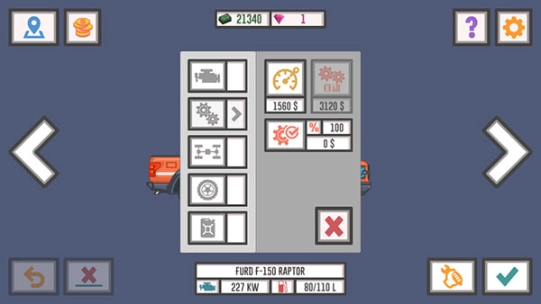 4、在这里可以改造卡车的各种属性,包括引擎、轮胎、耗油量等,改装是需要耗费一定时间的,你也可以选择使用金币来缩短改装时间。