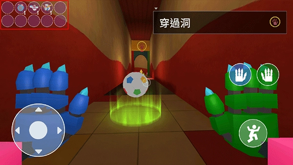 5、当手套收集完成会自动的带入手中,这个时候可以看到在墙的两侧有红色、蓝色的手印,玩家只需要将手套对着相对应的区域即可将房门打开。