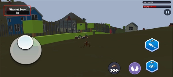 游戏中通过游戏左下角的摇杆来进行移动,双击游戏右下角的翅膀按钮来进行飞行,再通过游戏右上角的上下按钮来调整高度,需要注意的是飞行中还会消耗体力,体力消耗完就无法飞行,玩家需要在地上休息一会儿就会恢复。蚊子模拟器2游戏内当玩家发现目标后玩家可以点击游戏右下角的攻击按钮来进行攻击,当目标移动过快,玩家还可以点击游戏下方的加速按钮来加快移动,需要注意的是游戏左上角是游戏天黑倒计时,天黑后角色不会进行移动,这是玩家进攻的好时机。还