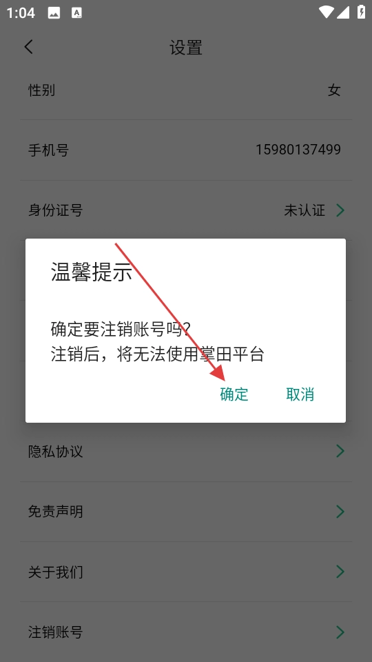 4、在注销温馨提示弹窗中,点击【确定】按钮,完成账号注销操作。