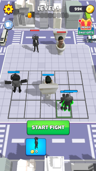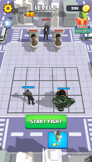 1、玩家能够花费金币购买监控人和马桶人,还可以通过拖动角色来调整它们在场上的位置,通常会把实力更强的角色放在前排承受伤害,而把相对较弱的角色安排在后排。点击START FIGHT即可开启战斗。