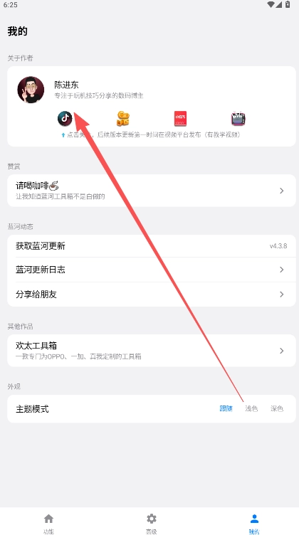 2、蓝河工具箱作者的发布渠道主要是在抖音短视频,点击跳转他的个人主页,找到关注选项即可。