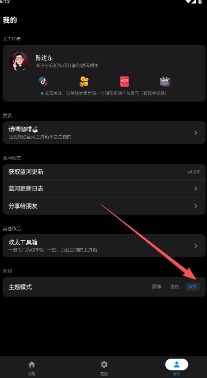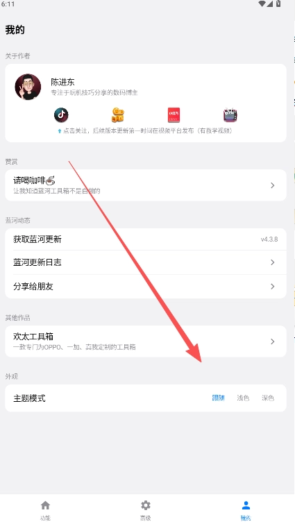 1、主题更改可在我的主页中进行操作,默认选项为跟随系统。