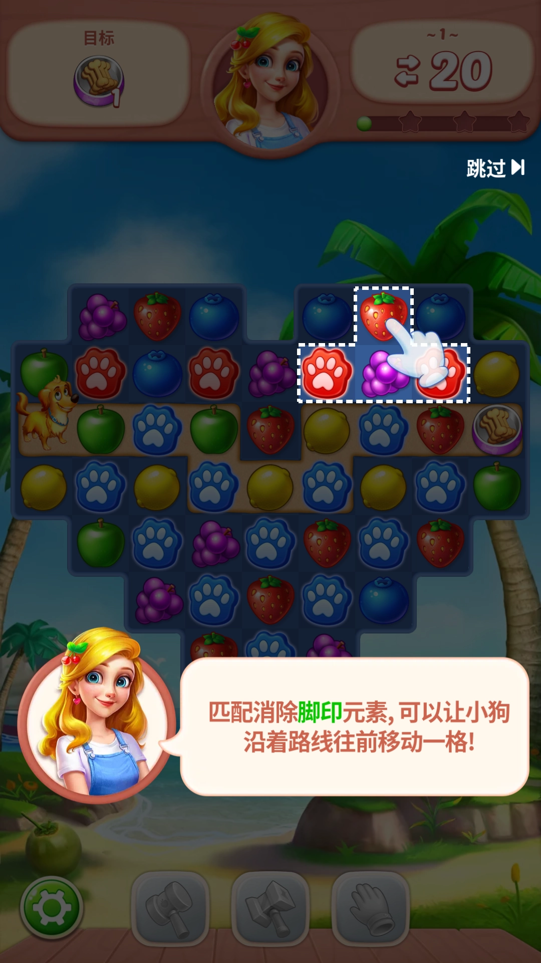 2、把相同颜色的脚印元素消除即可让狗狗向前走一步
