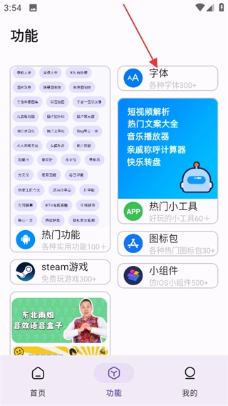 2、在功能页面,点击想使用的功能进入字体相关页面,如字体。