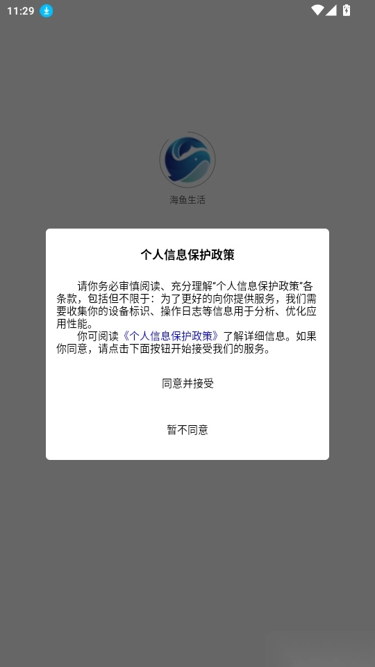 1.打开软件阅读“个人信息保护政策”点击“同意并接受”进入