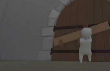 1、进入城堡关卡后,下图呈现的是Bob所在的首个场景。他需要双手搬起身旁的石块,朝着木门上的锁头猛冲过去,连续撞击两三次就能把锁毁坏。