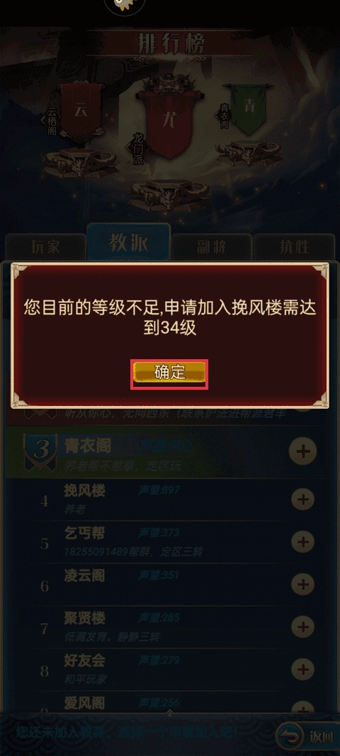 3、如果有一点需要注意的是,需要你的等级达到34级的时候,才能有申请加入教派的权限。