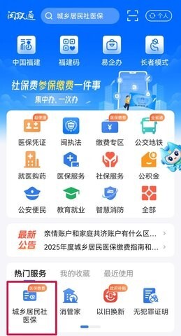 1、进入闽政通,在首页热门服务中找到【城乡居民社医保】并选择它。