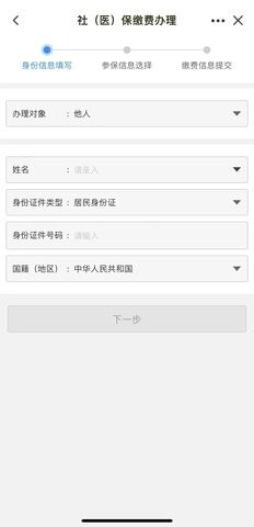 4、系统默认以您当前的账户信息作为缴费对象,若您需要为他人缴费,可点击【办理对象】下拉框,输入相应信息后,点击【下一步】完成身份校验。