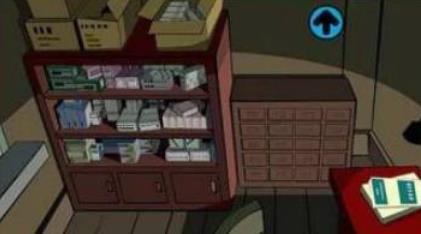 7.点下面的箭头,点右边桌子上的书,拿到中西药手册,点手册,点阅读,看到上面写着:甘草与阿司匹林合用会导致胃肠不良反应,点左下角工具箱,收回道具。点左侧西药柜,点药柜下层左侧的药盒,拿到阿司匹林,后退;点右侧中药柜,在随机的抽屉里拿甘草,继续找人参.灵芝。