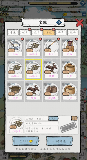 七:村民进京时,都会带上之前身上的装备,我认为无需卸下,这些装备能增加能耐与富裕程度。况且每次出门游历,村民都会随机带回装备,只要带回一件,我就一键赠送,如此一来,能耐和富裕值会持续增加。