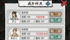 1、选择:开局选成年村民,只需要看他的资质,一般来说110以上比较好,有时间的可以刷到120以上,尽量选择高质量人类,会为你后面的培养节省很多精力