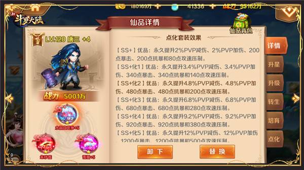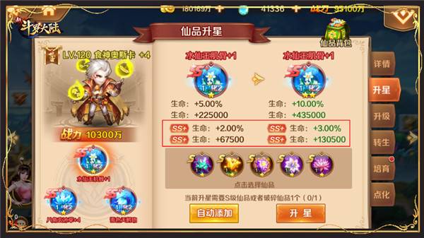 2、SS 仙品在升级、升星、转生能力数值上直接获得提升,稀有SS 仙品提升更大。