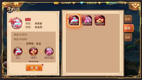 3、SS 仙品养成需要两个重要材料:稀有SS 仙品碎片和仙品精粹。稀有SS 仙品碎片:用于合成稀有SS 仙品。
